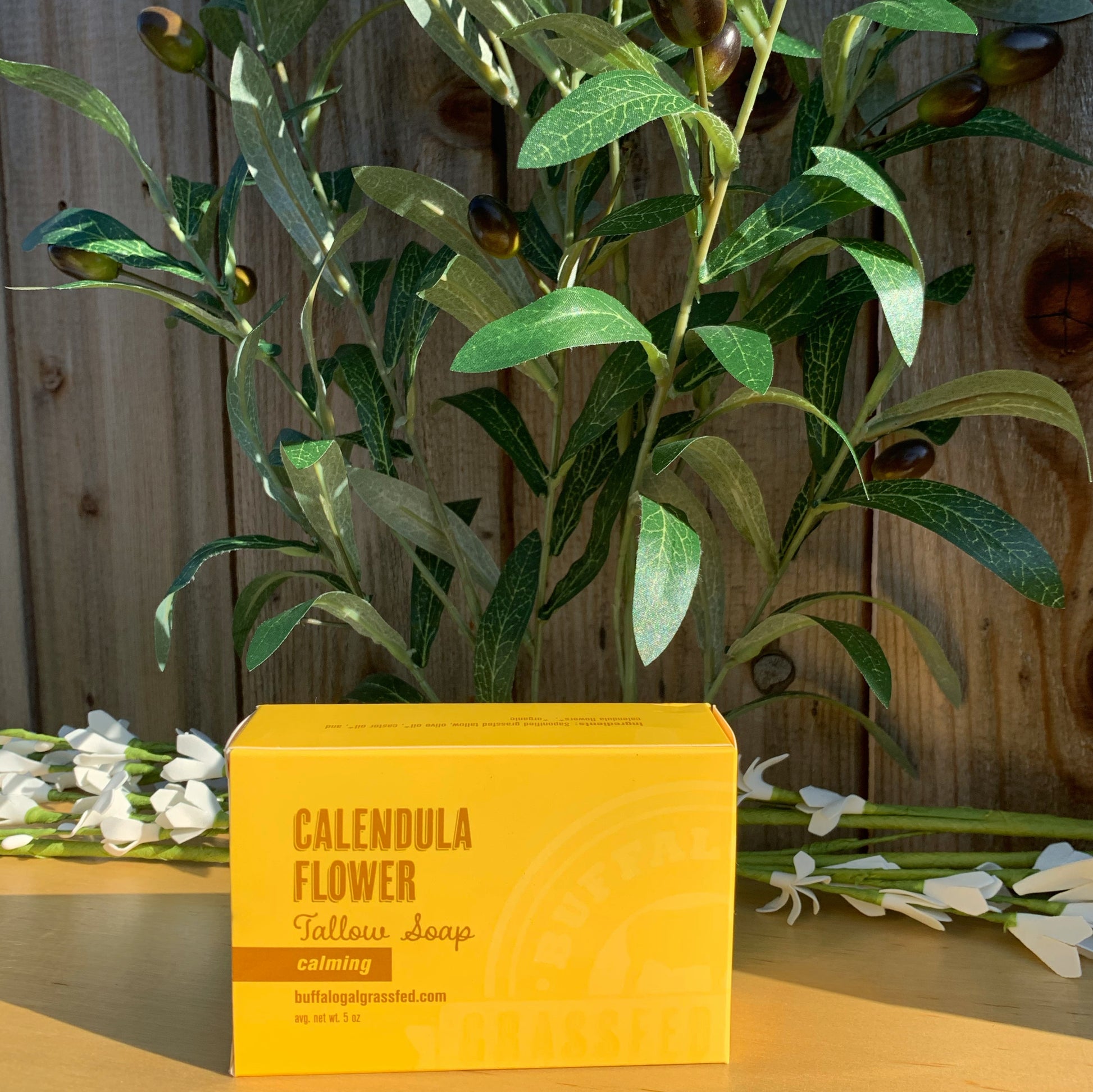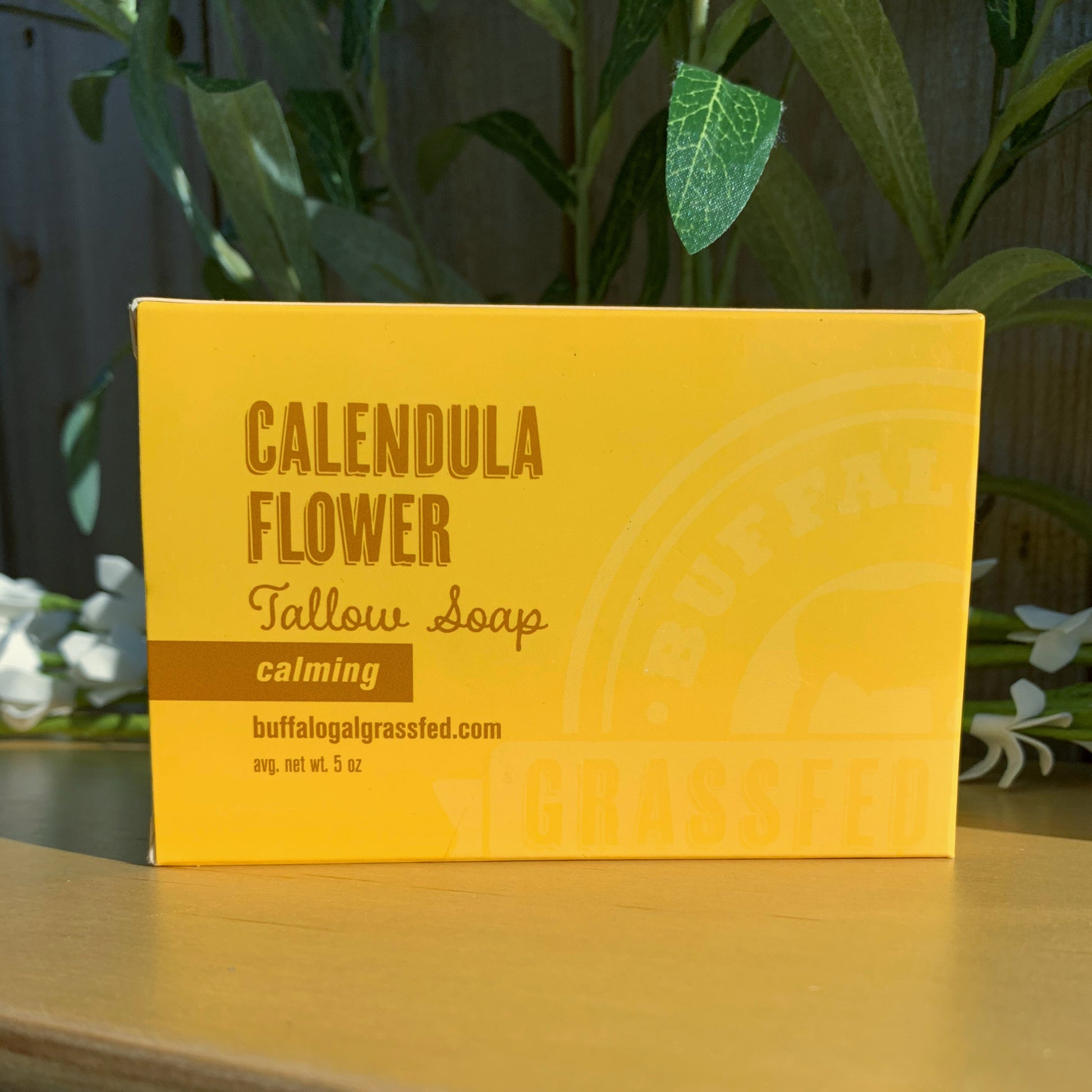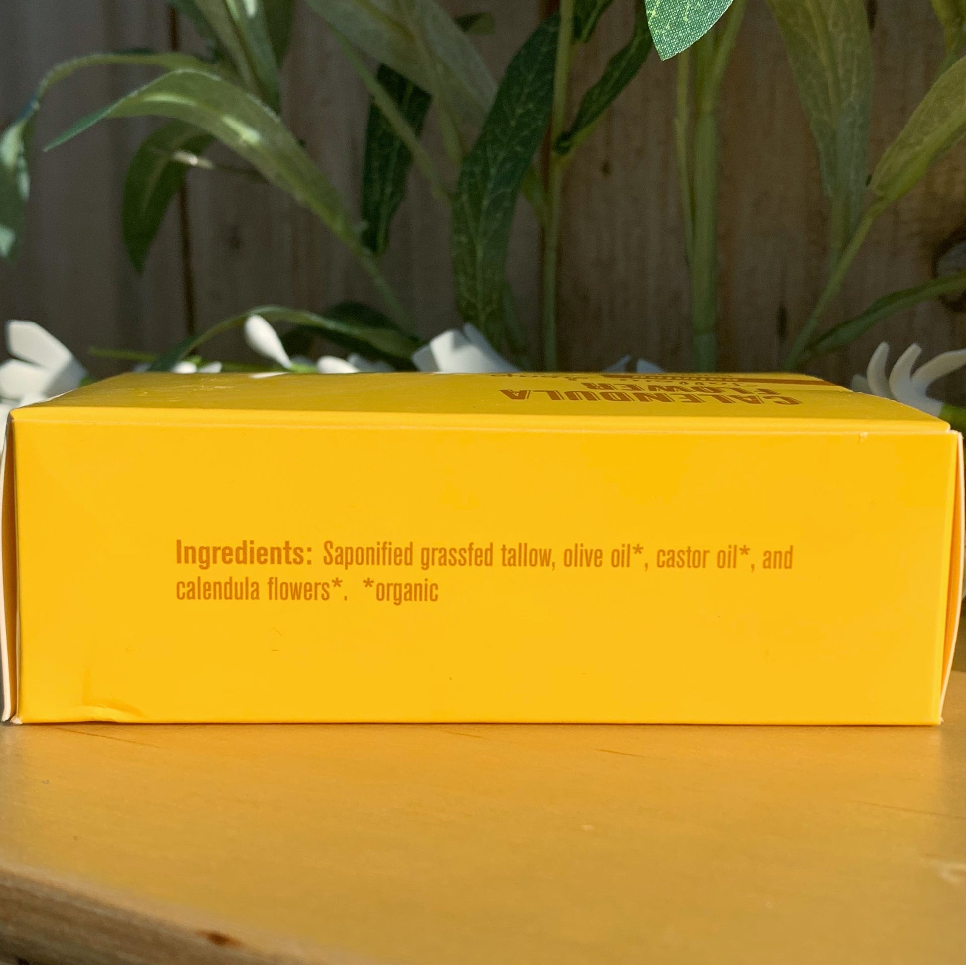 Ingredients: Saponified grass fed tallow, olive oil*, castor oil*, calendula flowers* (*Organic)
