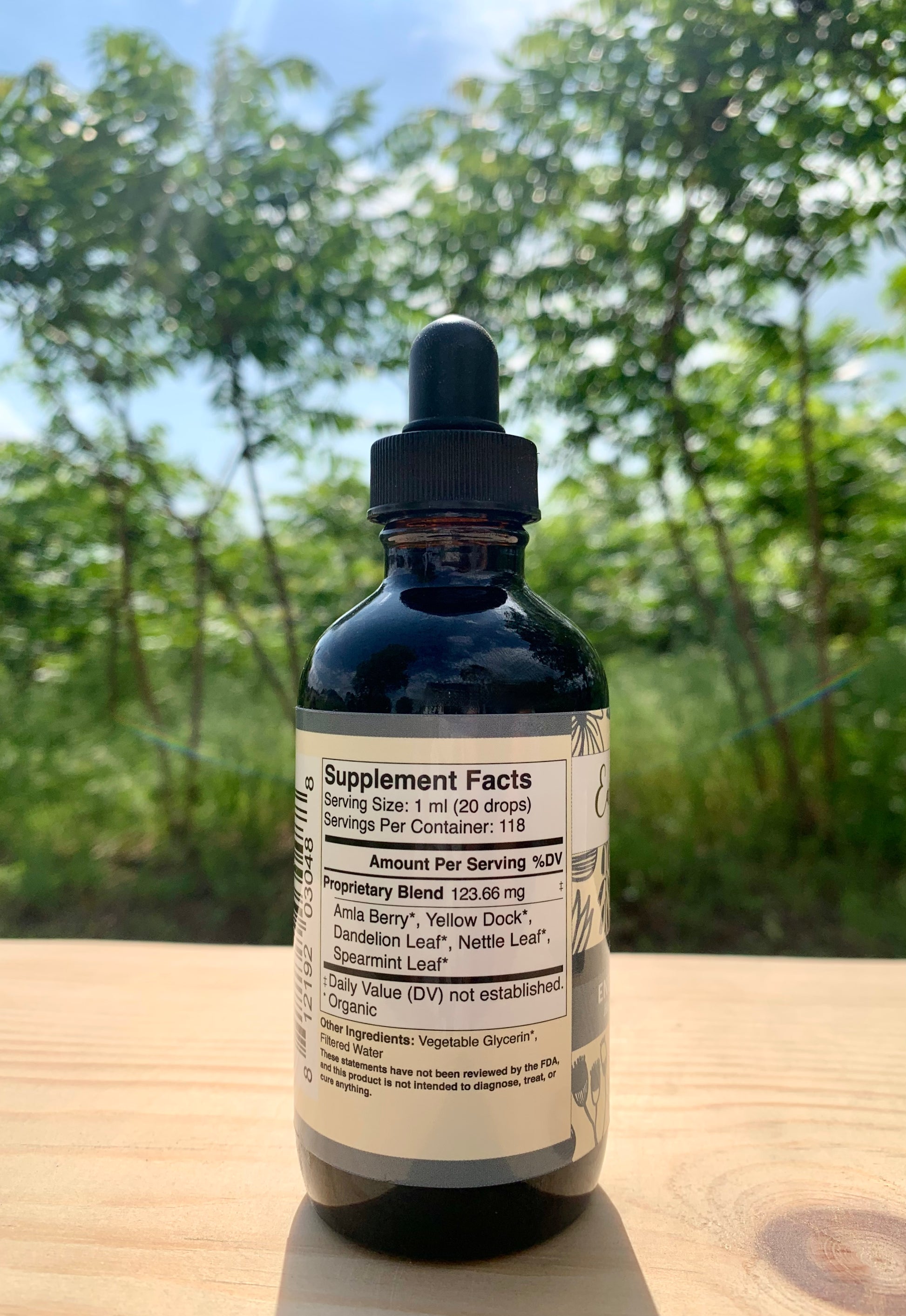 Ingredients: organic vegetable glycerin, filtered water, organic amla berry, organic yellow dock, organic dandelion leaf, organic nettle leaf, organic spearmint leaf