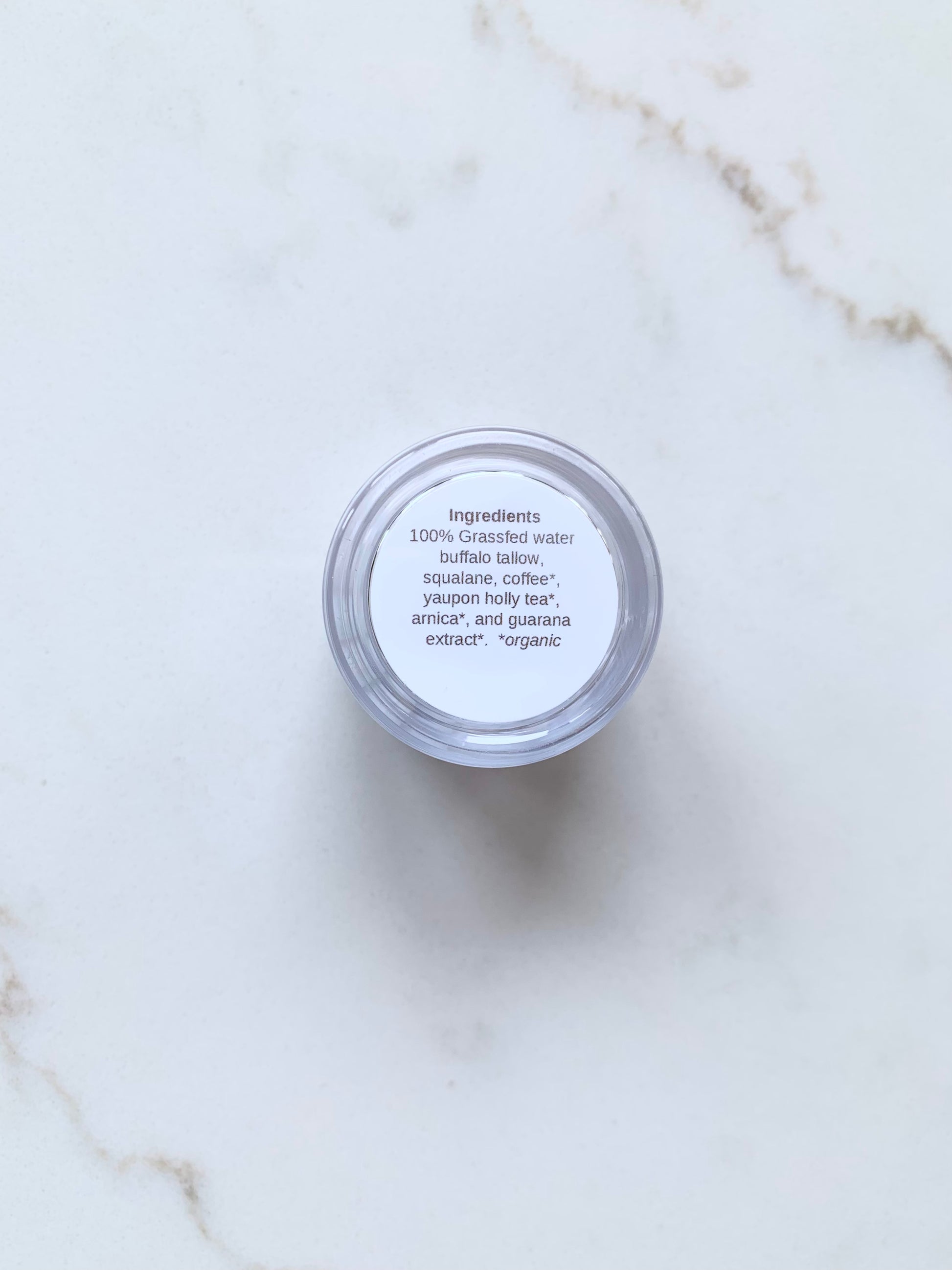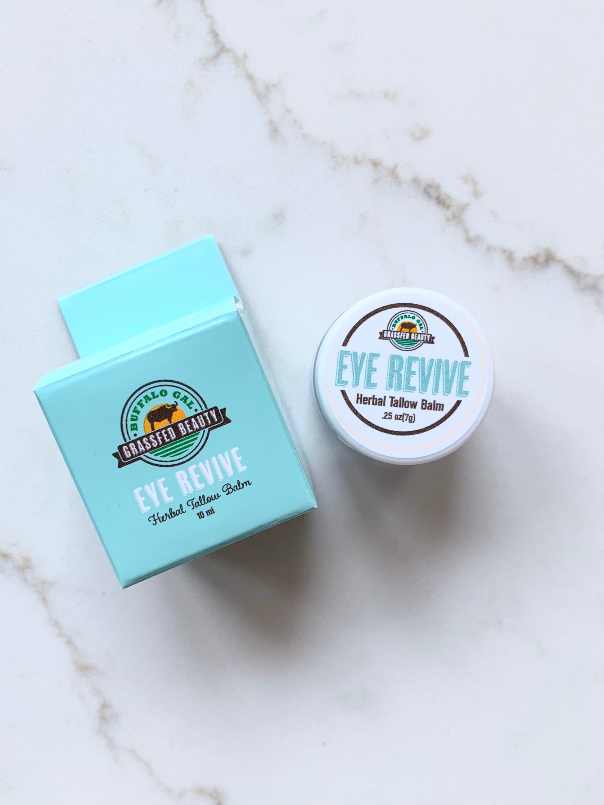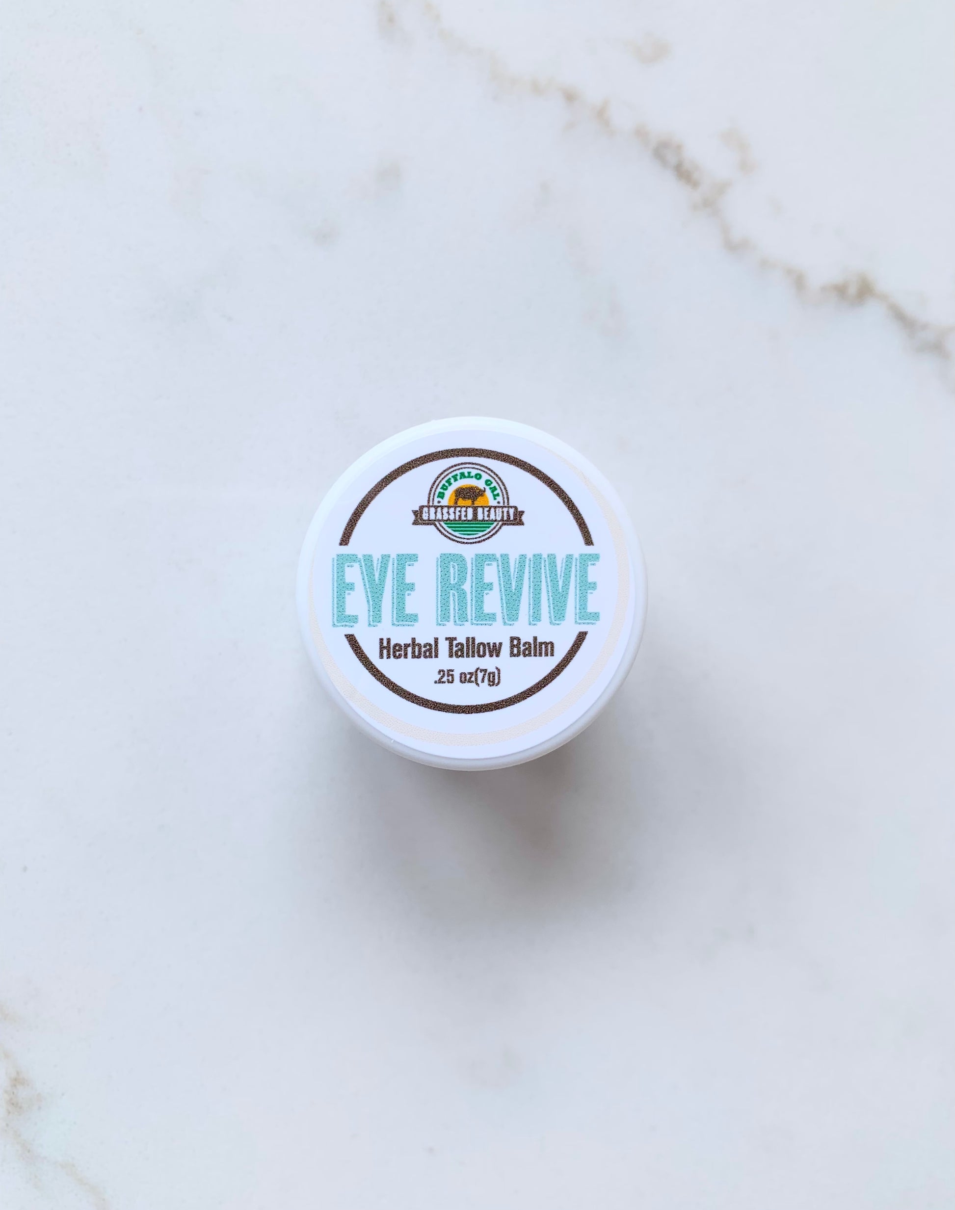 Looking to switch to natural skincare? Eye Revive is an herbal tallow balm that helps naturally reduce the signs of aging around the eye area. Made with just a few natural ingredients including coffee and squalane, this balm helps to moisturize, smooth, and decrease puffiness & sagging in the skin around the eyes. A little bit goes a long way!