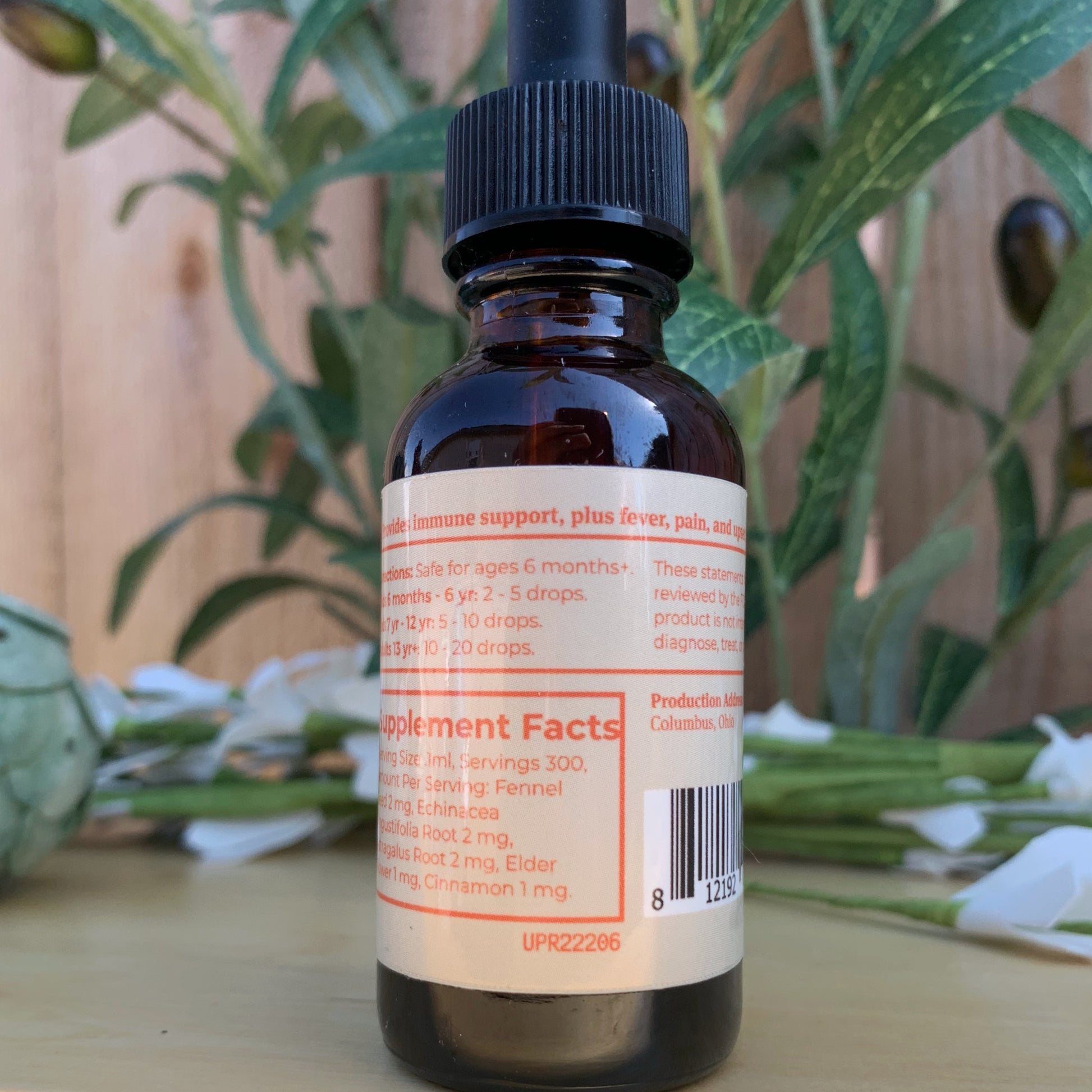 Ingredients: Echinacea Angustifolia root*, Fennel seed*, Astragalus root*, Elder flower*, Cinnamon*, Vegetable glycerin, Filtered water (*Organic Ingredients)