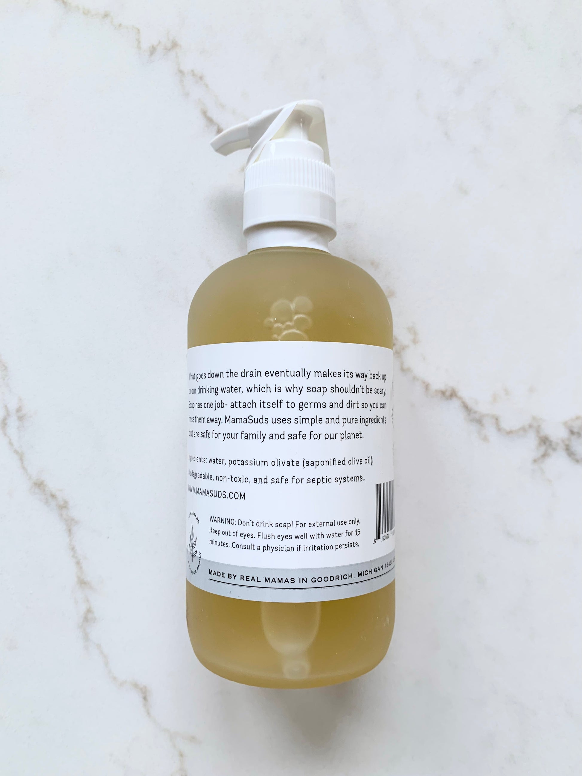 Mama Suds liquid hand soap is made in the USA with simple ingredients that are safe for the whole family! With no harmful ingredients, this unscented soap will leave your hands feeling nourished and soft, not dried out.