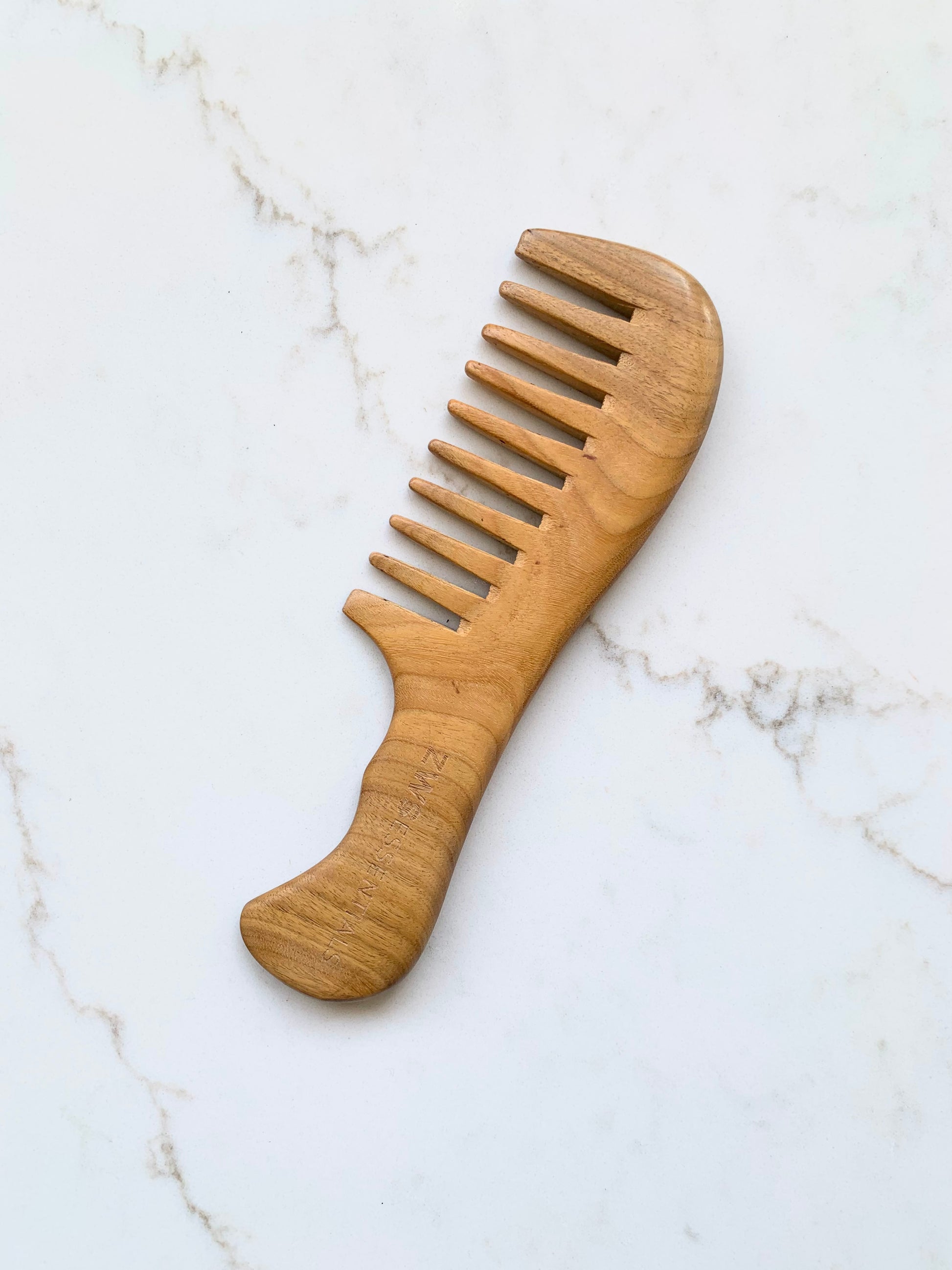 This handcrafted sandalwood wide tooth comb is made from green sandalwood and is 100% zero waste. It helps gently detangle the hair, is naturally anti-static and the natural fragrance of the wood can have a calming effect. As a bonus, sandalwood is also said to have anti-inflammatory effects!