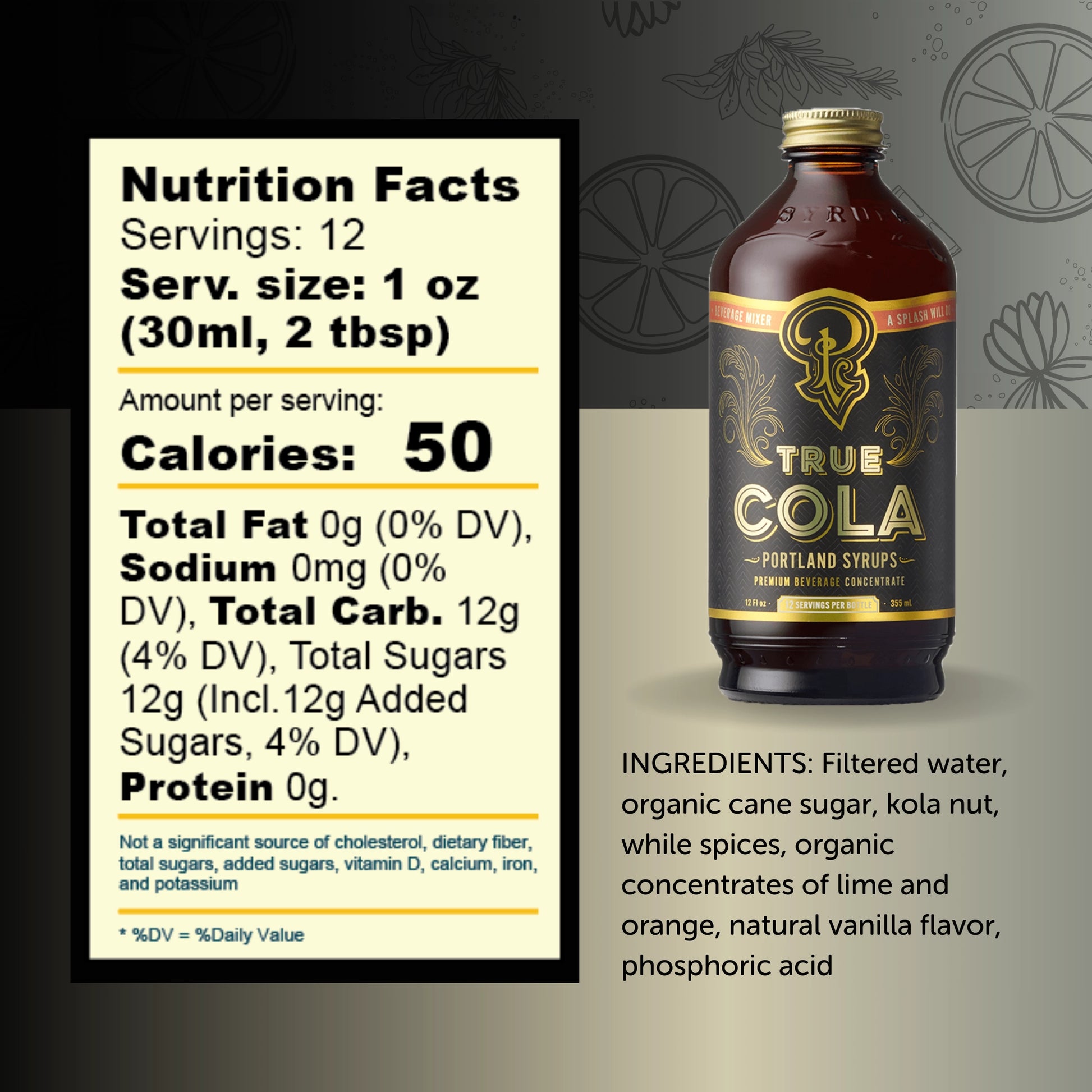 Looking for a real ingredient alternative to your favorite soda? Portland Syrups True Cola is made with real kola nut and whole spices giving it a richer flavor than conventional colas. Brewed in small batches in Portland, this syrup is made with just a few ingredients and is great to have on hand when you're craving a soda or to add to your mixed drinks! Each 12 oz. bottle makes approximately 12 to 24 drinks.